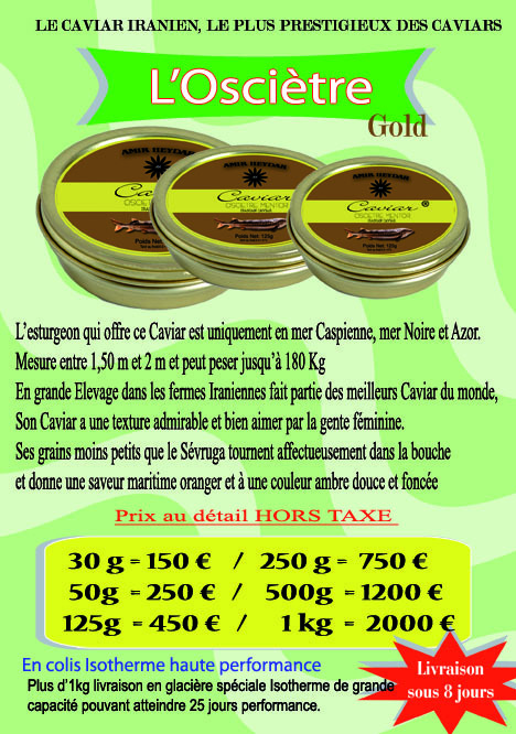 · L'OSCIETRE IRANIEN Prix au Détail TTC